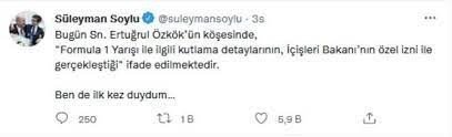 İçişleri Bakanı Süleyman Soylu ise Twitter hesabından yaptığı paylaşımda, "Bugün Sn. Ertuğrul Özkök'ün köşesinde, 'Formula 1 Yarışı ile ilgili kutlama detaylarının, İçişleri Bakanı'nın özel izni ile gerçekleştiği' ifade edilmektedir. Ben de ilk kez duydum…" ifadesini kullandı.