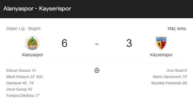 Süper Lig'in 9. haftasında sahasında 2 kez geriye düşen Alanyaspor, Kayserispor'u 6-3 mağlup etti. Sezonun şu ana kadarki en gollü maçında, ev sahibi takım adına golleri Efecan Karaca, Majid Hosseini (K.K), Davidson (2), Umut Güneş ve Diedhiou kaydetti. Kayserispor'un gollerini ise Onur Bulut, Mario Gavranovic ve Mustafa Pektemek attı.