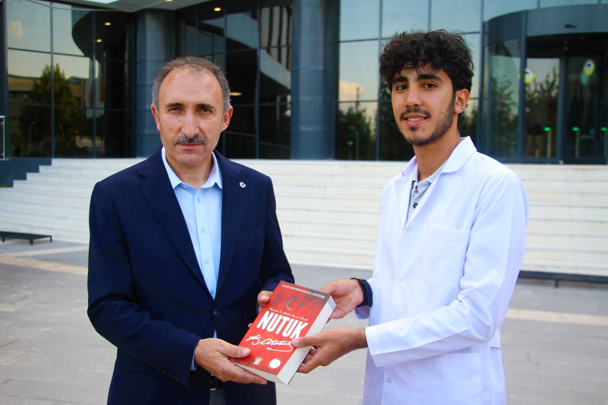 Fırat Üniversitesi Rektörü Prof. Dr. Fahrettin Göktaş, Tıp Fakültesi 5'inci sınıf öğrencisiyle bir araya gelerek muhabbet ettikten sonra öğrenciye 'Nutuk' hediye etti.