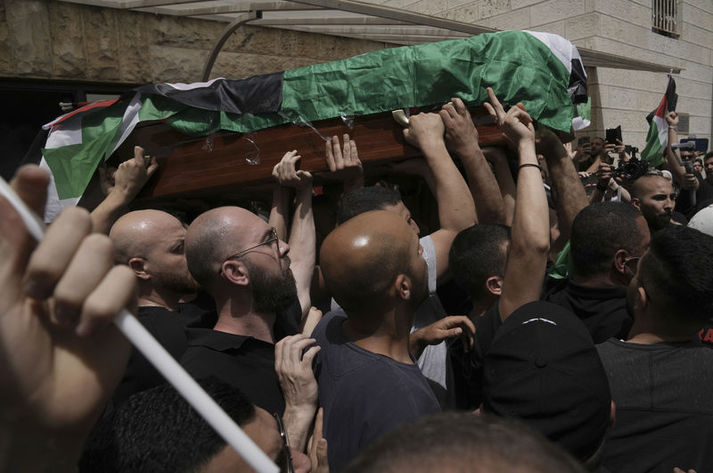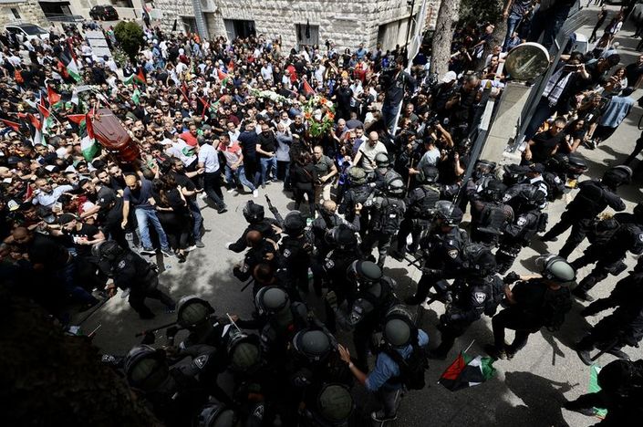 Öldürülen Filistinli kadın gazeteci Şirin Ebu Akile'nin tabutu omuzlarda ve onlarca Filistin bayrağıyla ilerlerken aralarında atlıların da bulunduğu İsrail polisi cenazeye katılanlara cop, ses bombası ve kauçuk kaplı mermiyle müdahale etti. Sağlık ekipleri yaralılara müdahale etti.