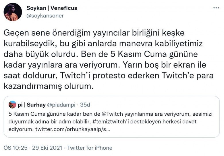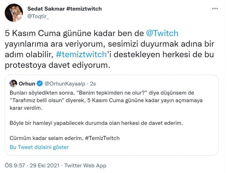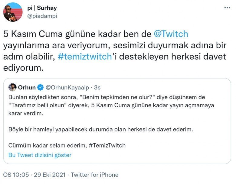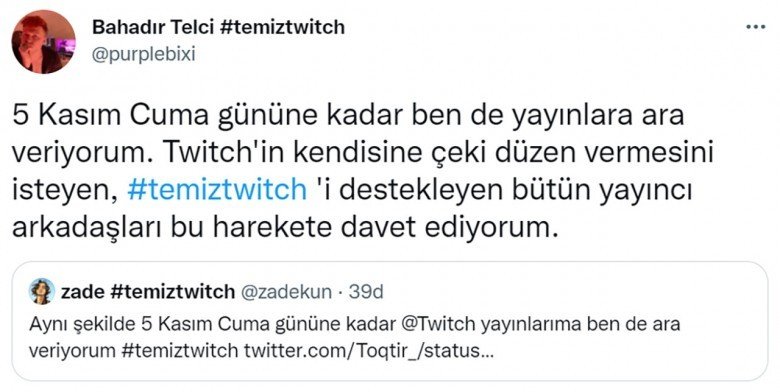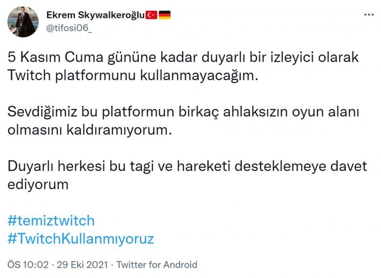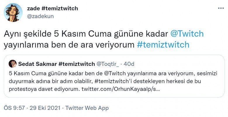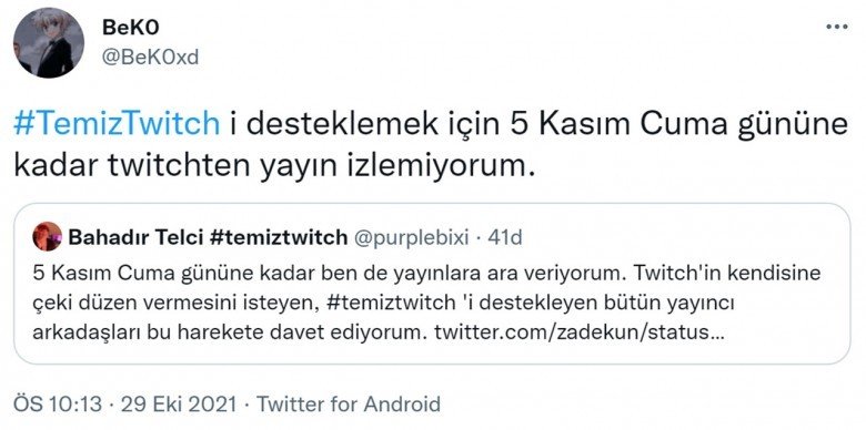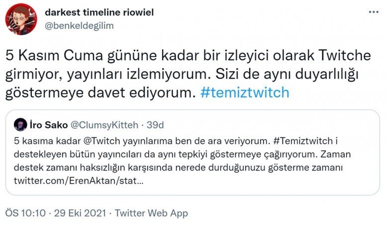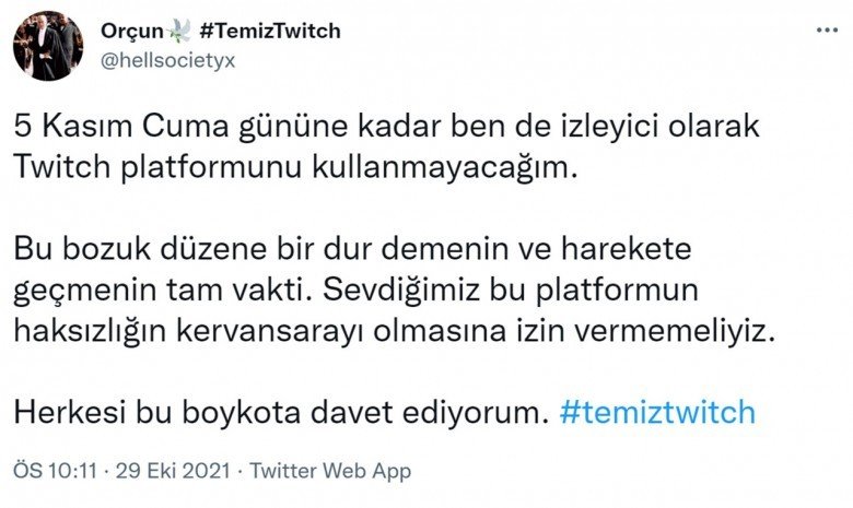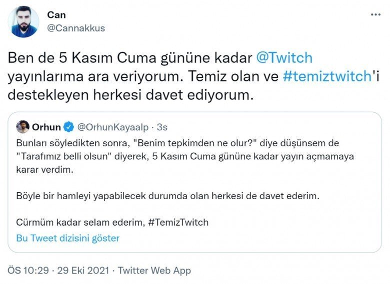 Twitter’da başlayan boykot açıklamalarına büyüklü küçüklü yayıncılar ve Twitch izleyicileri destek verdi. Yayıncılar, ‘#temiztwitch’ etiketiyle Twitch’in temiz bir yer olmasını sağlamak isterken seslerini daha fazla duyurmak için Twitch’te yayın açmayacaklarını, izleyiciler de Twitch kullanmayacaklarını belirtti. Ünlü yayıncılardan ve izleyicilerden gelen paylaşımlardan bazıları şu şekildeydi: